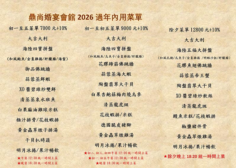 午宴 12:00 晚宴18:30 統一時間上菜。